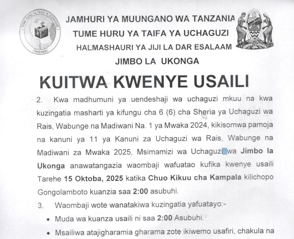 Katika maandalizi ya Uchaguzi Mkuu wa Rais, Wabunge, na Madiwani wa mwaka 2025, Halmashauri ya Jiji la Dar es Salaam kupitia Jimbo la Ukonga imetangaza orodha ya waombaji waliochaguliwa kushiriki katika usaili wa nafasi za usimamizi wa uchaguzi. Zoezi hili linakusudia kuhakikisha uteuzi wa wasimamizi wenye sifa, weledi, na uadilifu, ili uchaguzi uendelee kufanyika kwa uwazi, haki, na ufanisi mkubwa.