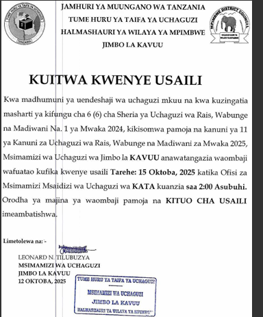 Halmashauri ya Wilaya ya Mpimbwe, kupitia Jimbo la Kavuu, imetangaza rasmi orodha ya waombaji waliochaguliwa kufanyiwa usaili kwa ajili ya nafasi za kusimamia Uchaguzi Mkuu wa mwaka 2025. Tangazo hili limetolewa na Msimamizi wa Uchaguzi wa Jimbo la kavuu, likieleza utaratibu wa usaili kwa wale wote waliopendekezwa kushiriki katika mchakato huu muhimu wa kitaifa.