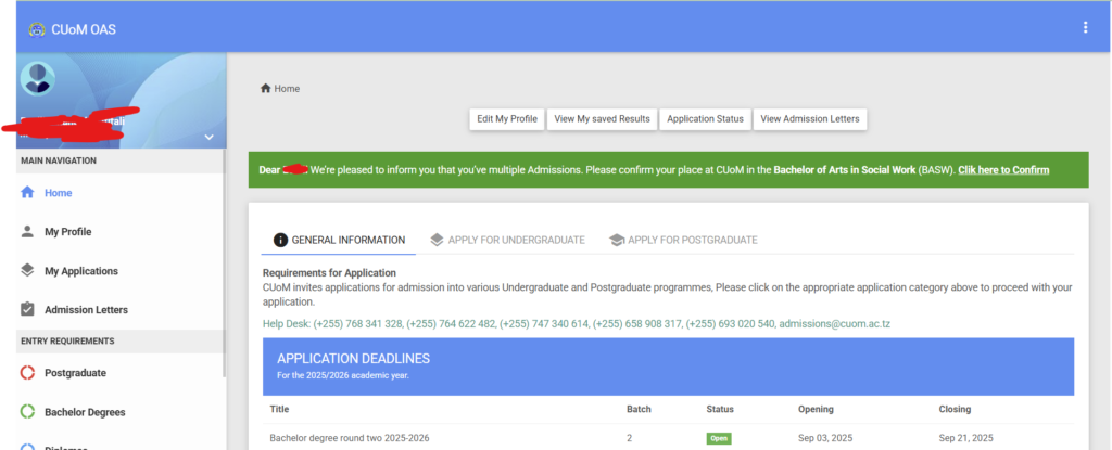 - Angalia Hali ya Maombi: Baada ya kuingia, tafuta sehemu inayosema “Hali ya Maombi” au “Admission Status”. Hapa utaweza kuona kama umechaguliwa kujiunga na CUoM kwa mwaka wa masomo wa 2025/2026.