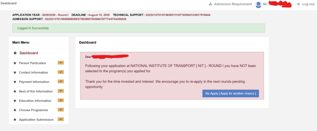 - Angalia Hali ya Udahili: Baada ya kuingia kwenye akaunti yako, nenda kwenye sehemu ya “Hali ya Udahili” au “Admission Status”. Hapa utaweza kuona kama umechaguliwa kujiunga na NIT na programu uliyopewa.